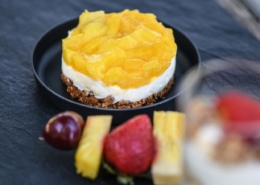 Un dessert frais, coloré, bien présenté… et la magie opère. Comme par exemple un cheesecake léger aux fruits jaunes (manque, pêche, fruit de la passion...) et sa base croustillante...